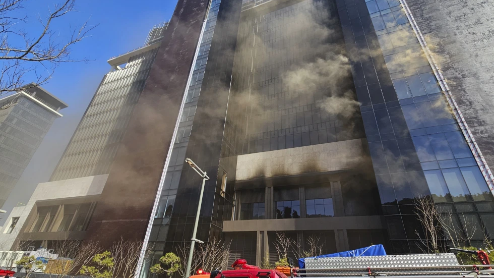 Television footage showed gray-black smoke and flames rising from the site and a helicopter approaching the building as part of rescue efforts.