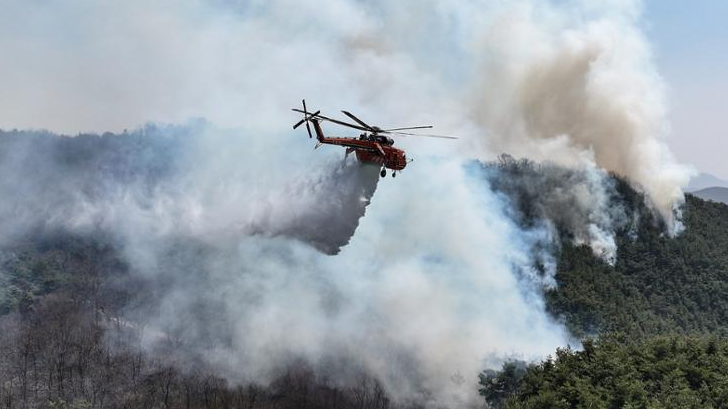 Some 100 helicopters from the Korea Forest Service (KFS), police, fire department, military and local governments have been mobilized to battle the fires in the three regions, where thousands of hectares of land have been scorched, along with more than 600 fire trucks and other equipment and nearly 6,400 personnel.