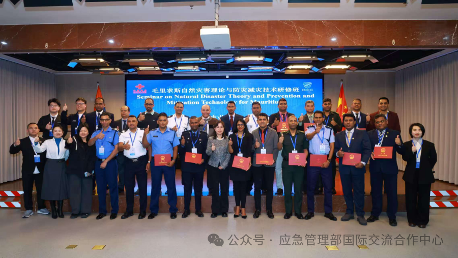 On November 17, 2025, the 21-day Seminar on Natural Disaster Theory and Prevention and Mitigation Technology for Mauritius for Mauritius concluded successfully in Beijing. The International Exchange and Cooperation Center of the Ministry of Emergency Management hosted a closing ceremony, where completion certificates were awarded to 22 participants from Mauritius.