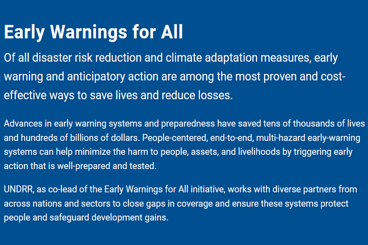 This is why in March 2022 the UN Secretary-General launched the Early Warnings for All initiative which called for every person on Earth to be protected by early warning systems by 2027.