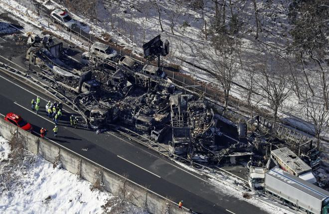 连环相撞的远端发生了火灾,火势蔓延至20辆车,其中一些车被完全烧毁。警方称,大火约7小时后才被扑灭。