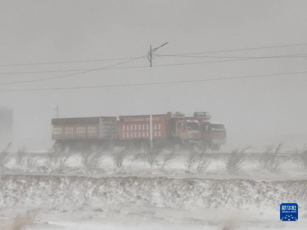 5月20日,在蒙古国苏赫巴托尔省,货车在暴风雪中行驶。新华社发(蒙古国苏赫巴托尔省BBS电视台供图)