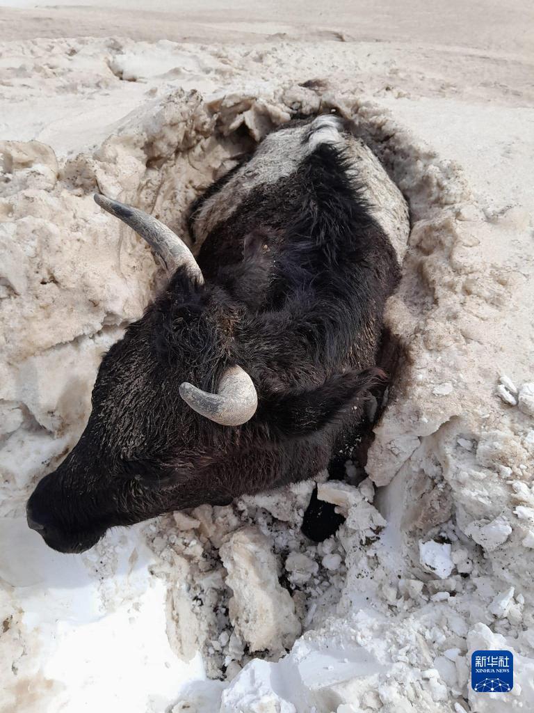 5月20日,在蒙古国苏赫巴托尔省,一头牛被埋在雪堆中。新华社发(蒙古国苏赫巴托尔省BBS电视台供图)