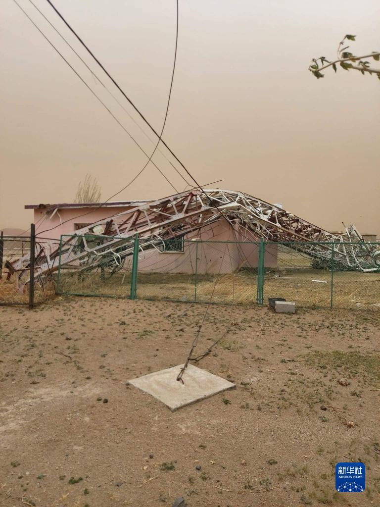 这是5月20日在蒙古国苏赫巴托尔省拍摄的被刮倒的电线杆。