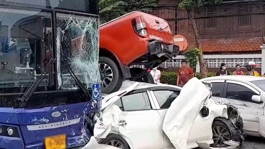 当地时间9月26日上午,泰国曼谷拉玛2路一处十字路口发生连环撞车事故。一辆公交车因刹车失灵撞上了停在路边的一辆汽车,导致一共10辆汽车连环相撞,初步统计造成19人受伤。