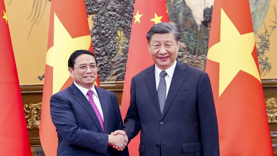 习近平指出,去年中共二十大闭幕后,我邀请阮富仲总书记来访,共同为中越关系发展定向把舵。今年是中越建立全面战略合作伙伴关系15周年,两国各层级交往日益密切,我同阮富仲总书记达成的共识正在得到落实。中方视越方为周边外交的优先方向和具有战略意义的命运共同体,这是中方基于两国关系长远发展作出的战略选择。面对日益严峻复杂的国际形势,中越两国要秉持平等互利、团结互信、合作共赢精神,携手合作、共谋发展,更好造福两国人民,为变乱交织的世界注入更多稳定性。