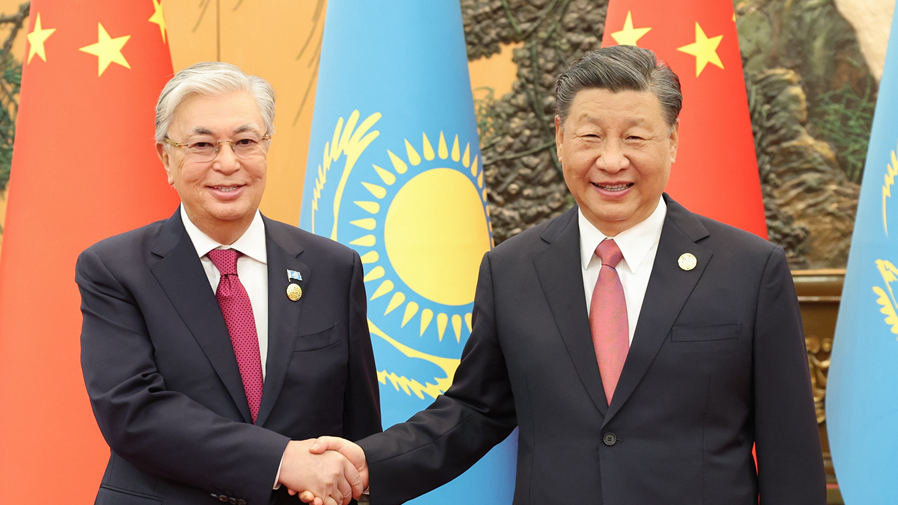 国家主席习近平在北京人民大会堂会见来华出席第三届“一带一路”国际合作高峰论坛的哈萨克斯坦总统托卡耶夫。